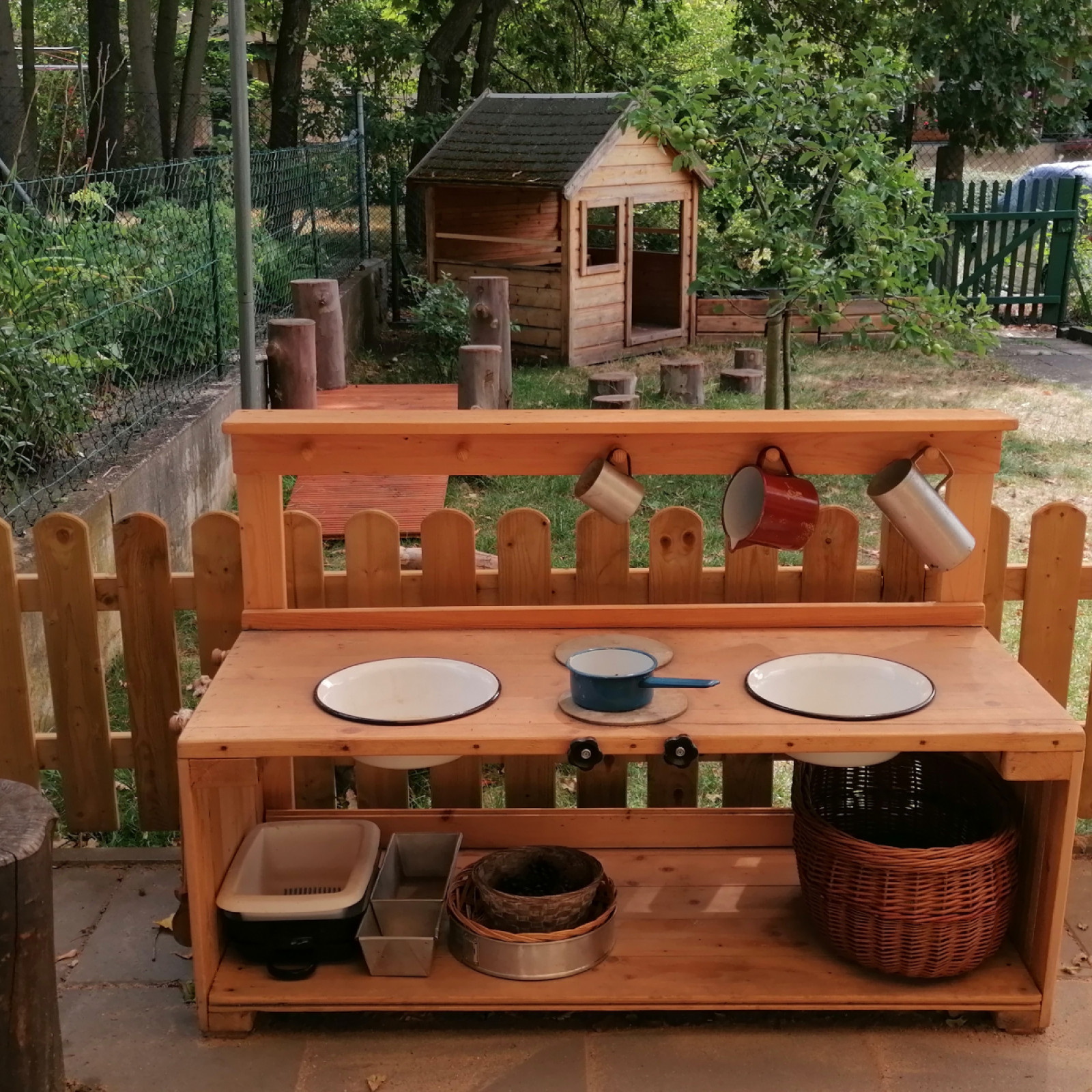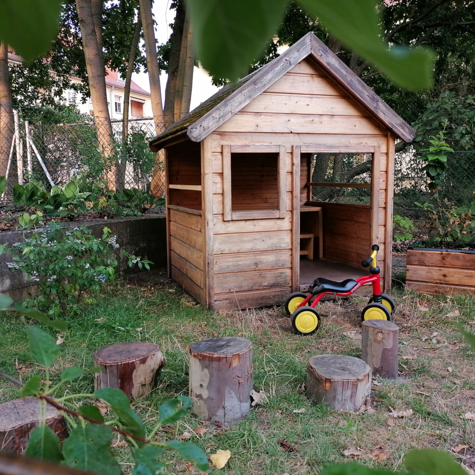 Spielhaus, Sandkasten, Matschküche, Schaukel, Kinderbeeten und verschiedenen