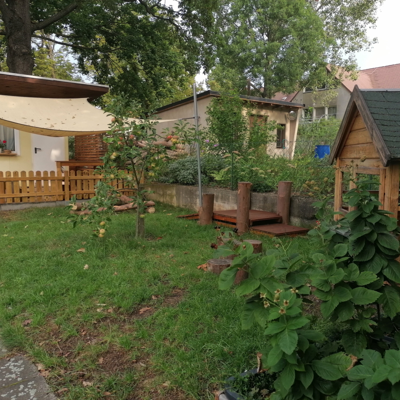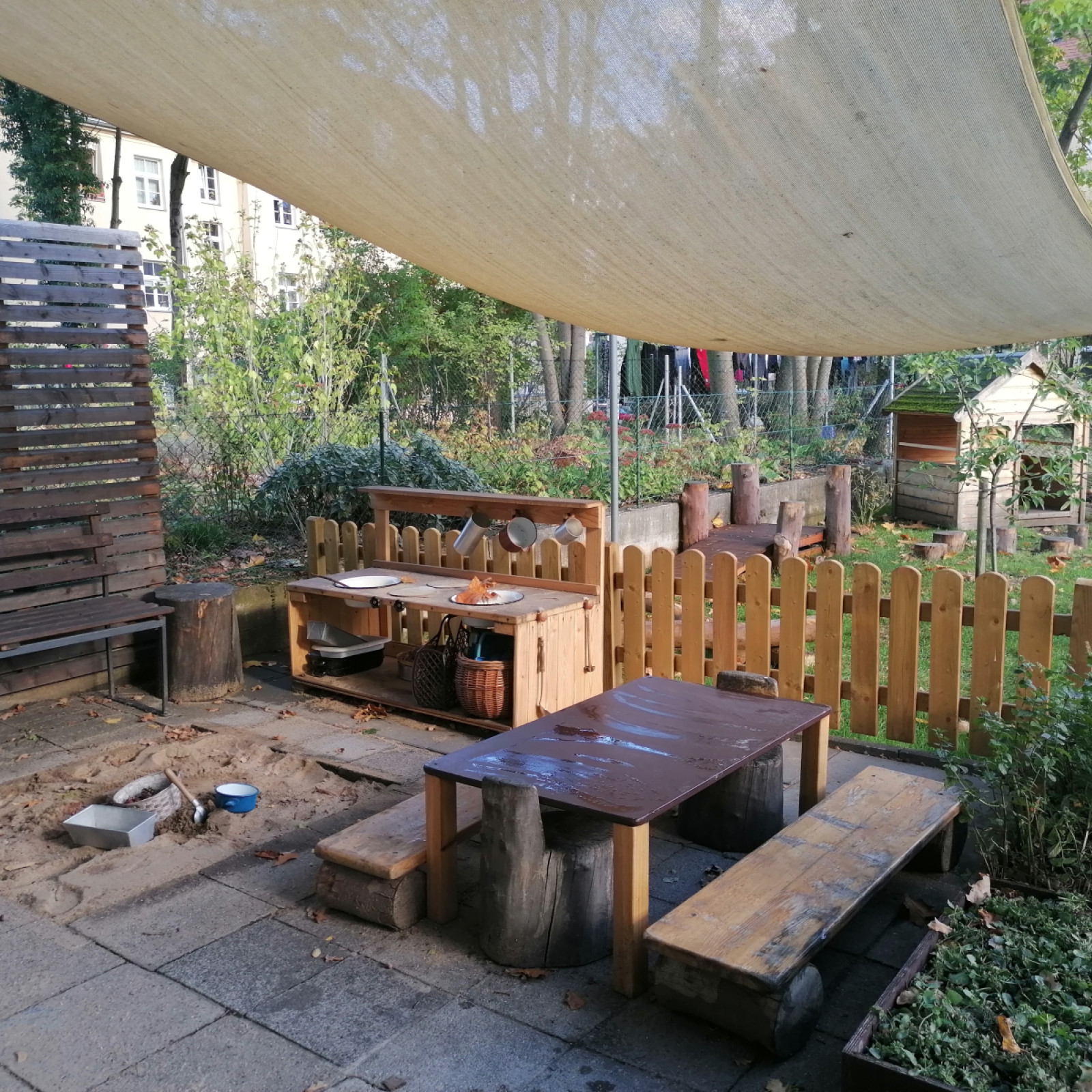 Den Kindern steht zusätzlich eine Spielfläche in der nahegelegenen Kleingartenanlage zur Verfügung. Sie ist ca. 130 m² groß und mit einem