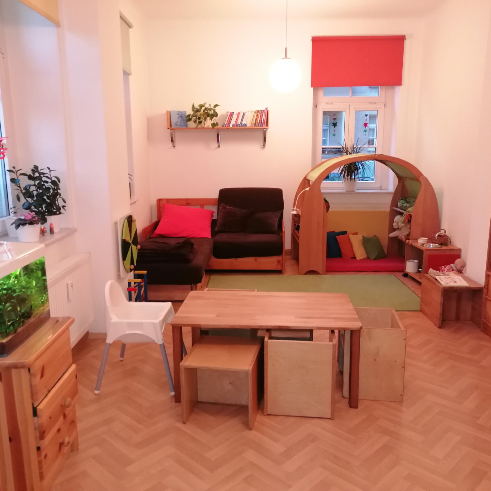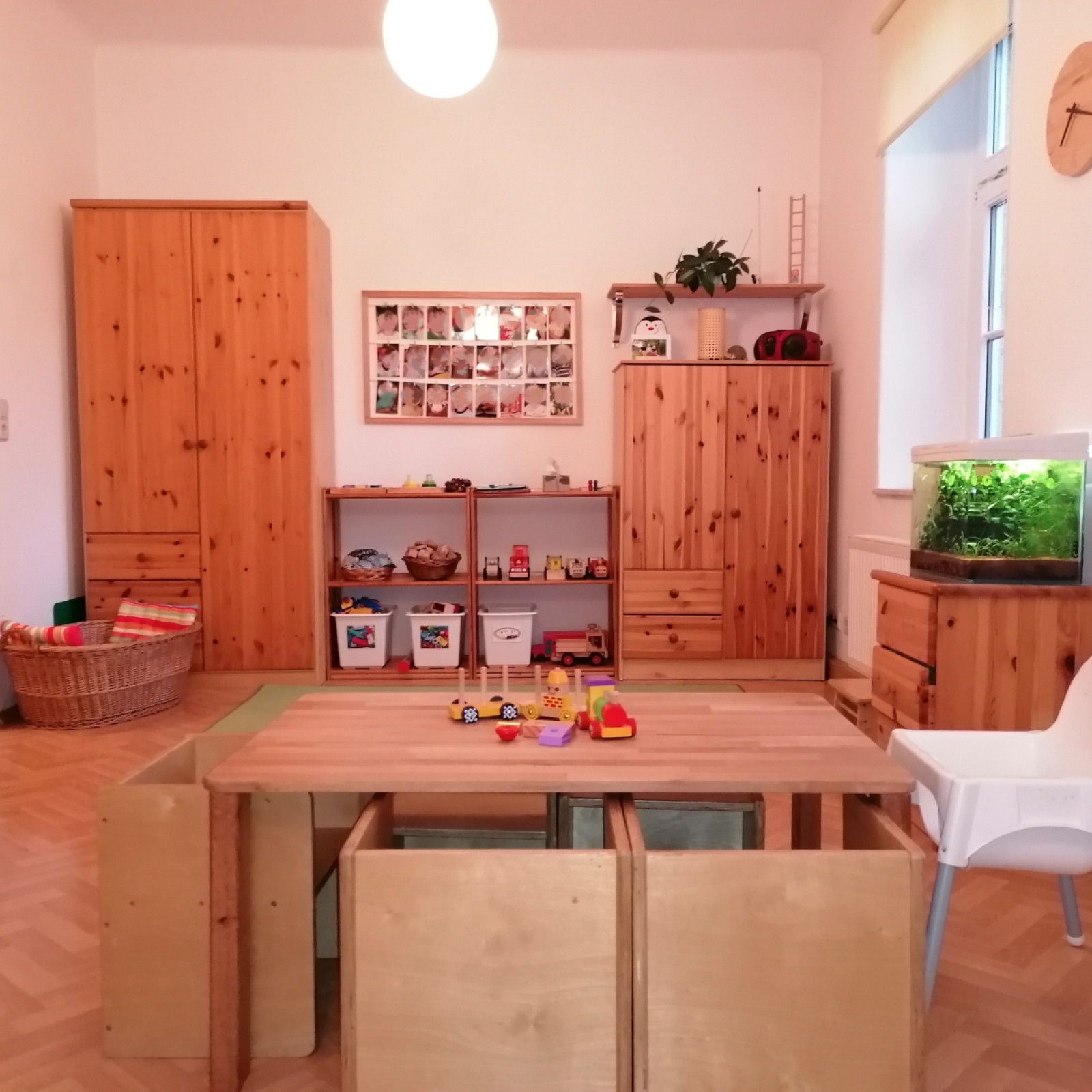 Das Spiel- und Esszimmer ist Mittelpunkt der Wohnung und mit altersgerechten Spielmaterialien, einer Bau-, Kuschel- und Puppenecke sowie einem kleinen Aquarium mit Fischen und Garnelen ausgestattet. Durch die verschiedenen Bereiche bieten sich den Kindern kleine Inseln zum Basteln, Spielen und Toben. An dem großen Tisch nehmen wir gemeinsam unsere Mahlzeiten ein. Die Küche wird für Essenvorbereitungen genutzt.