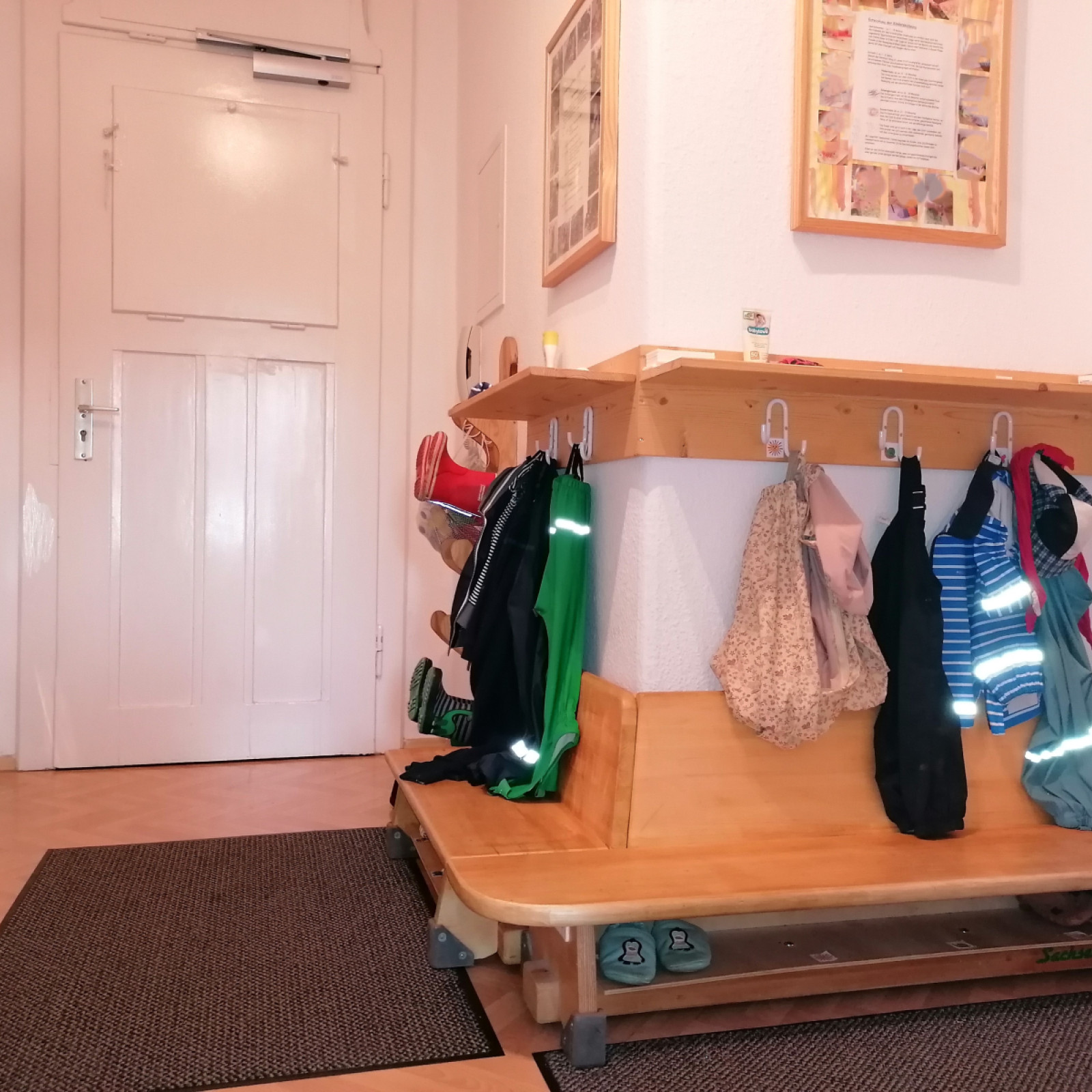 Im Flur befindet sich eine Garderobe mit Kinderbank. Jedes Kind hat dort seinen Platz mit eigenem Symbol. An der Infotafel können sich die Eltern über den Speiseplan, Urlaubszeiten und wichtige Termine informieren. Eine kleine Fotoausstellung berichtet über den Alltag und die Erlebnisse der Kinder. Auch die Mal- und Bastelarbeiten der Kinder erhalten einen Platz.