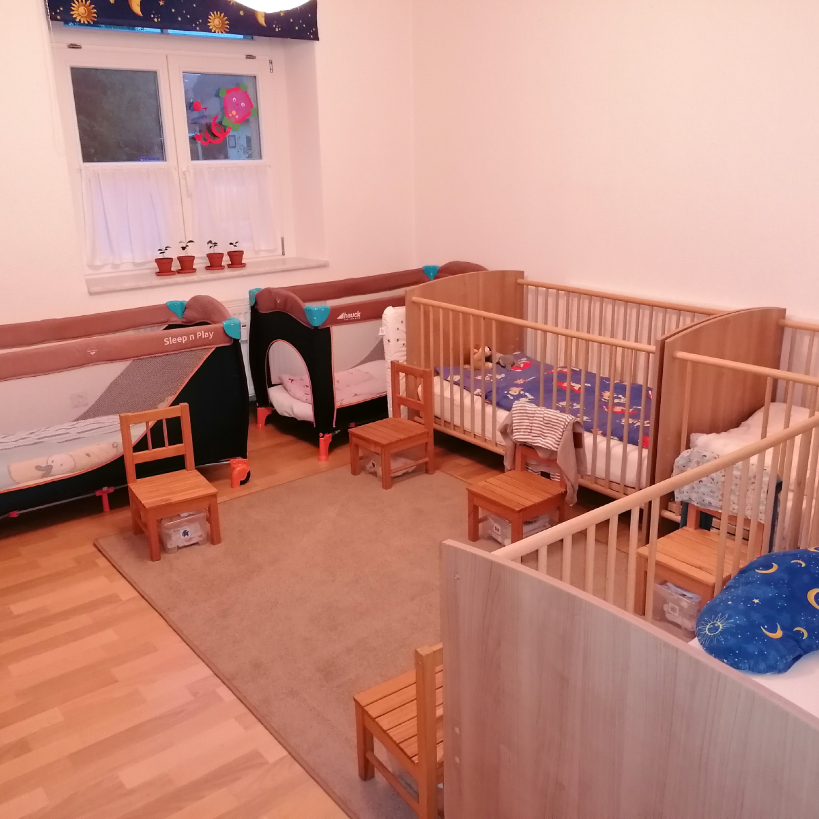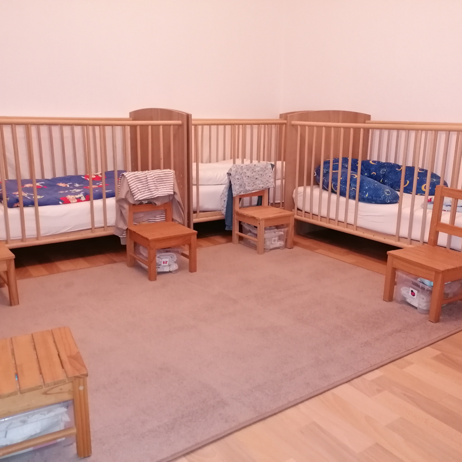 Im separaten Schlafbereich hat jedes Kind sein eigenes Bettchen, das es mit persönlichen Gegenständen wie Kuscheltier oder Schmusetuch gemütlich einrichten kann. Im Bad stehen Töpfchen und Kindertoilettensitz sowie eine Fußbank bei WC und Waschbecken bereit. Handtücher und Spiegel sind in kindgerechter Höhe angebracht.